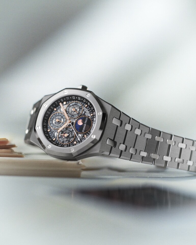Ein neues, hauseigenes offen gearbeitetes Automatikwerk mit Ewigem Kalender tickt in diesem 41-Millimeter-Modell der Royal Oak von Audemars Piguet. Die Manufaktur feierte noch einer jahrelangen Pause ein fulminantes Comeback in Genf.